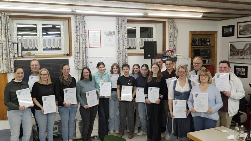 Robert Pöschel überreichte 14 Musikerinnen und Musikern Urkunden für bestandene Bläserprüfungen. Für 20 Jahre aktives Musizieren wurden Lukas Zimmermann und Erwin Bier geehrt, für 40 Jahre Franz Nusser und Robert Wiest. Pöschel betonte die Bedeutung der Stadtkapelle als zentralen Kulturträger der Stadt und lobte die außergewöhnliche musikalische Vielfalt des Vereins.
