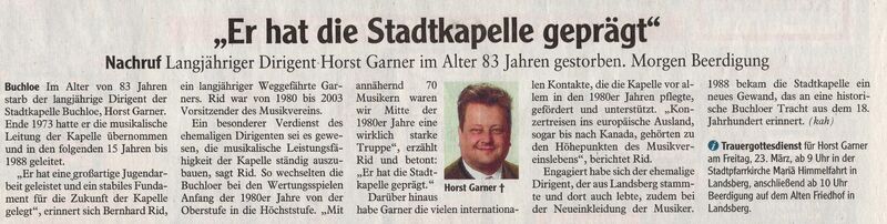 Im Alter von 83 Jahren starb der langjährige Dirigent der Stadtkapelle Buchloe, Horst Adolf Garner. Von 1973 bis 1988 leitete er die Kapelle und bildete Jungmusiker aus.
