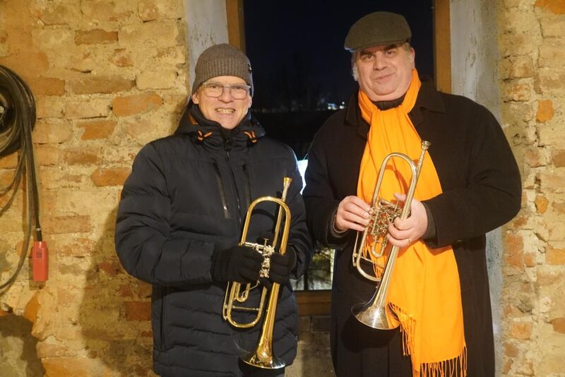 Unsere Trompeter Jürgen und Rainer spielen musikalische Silvestergrüße aus dem Dachbodenfenster der Stadtpfarrkirche.
