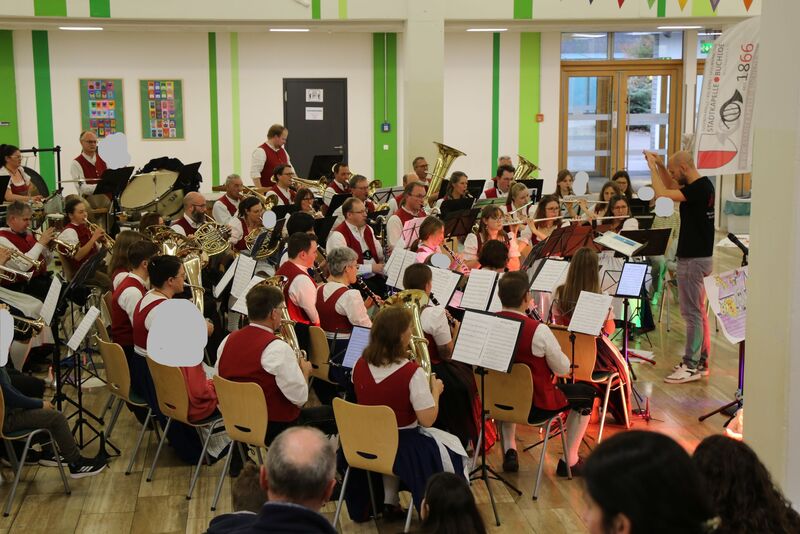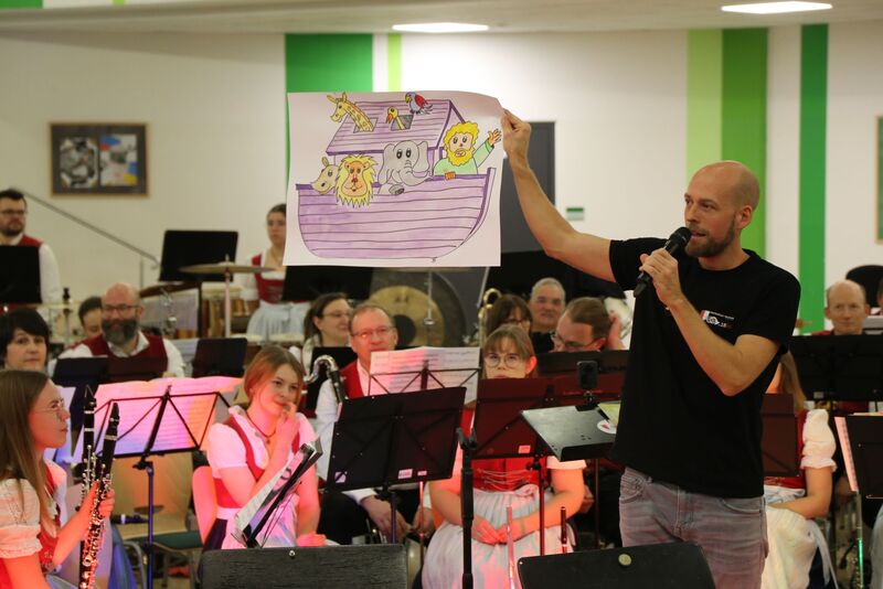 Action war angesagt beim Sitzkissenkonzert des großen Blasorchesters. Die Kinder unterstützen das Orchester rhythmisch mit Schütteleiern bei den Arabian Dances von Brian Balmages, machten Sturmgeräusche für die Arche Noah und sangen bei Timo Forströms Sons of the Midnight Sun spontan mit. Dabei konnten sie auch die Perspektive wechseln und zwischen den Musikerinnen und Musikern im Orchester Platz nehmen.