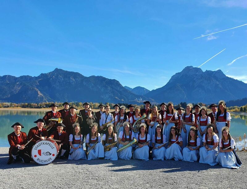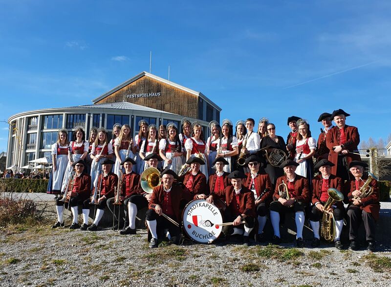 Die Stadtkapelle war bei strahlendem Sonnenschein und spätsommerlichen Temperaturen am letzten Oktobertag in Füssen zu Gast. Mit Blick auf das Schloss gaben die Musikerinnen und Musiker ein "Sonntagskonzert" vor dem Festspielhaus.